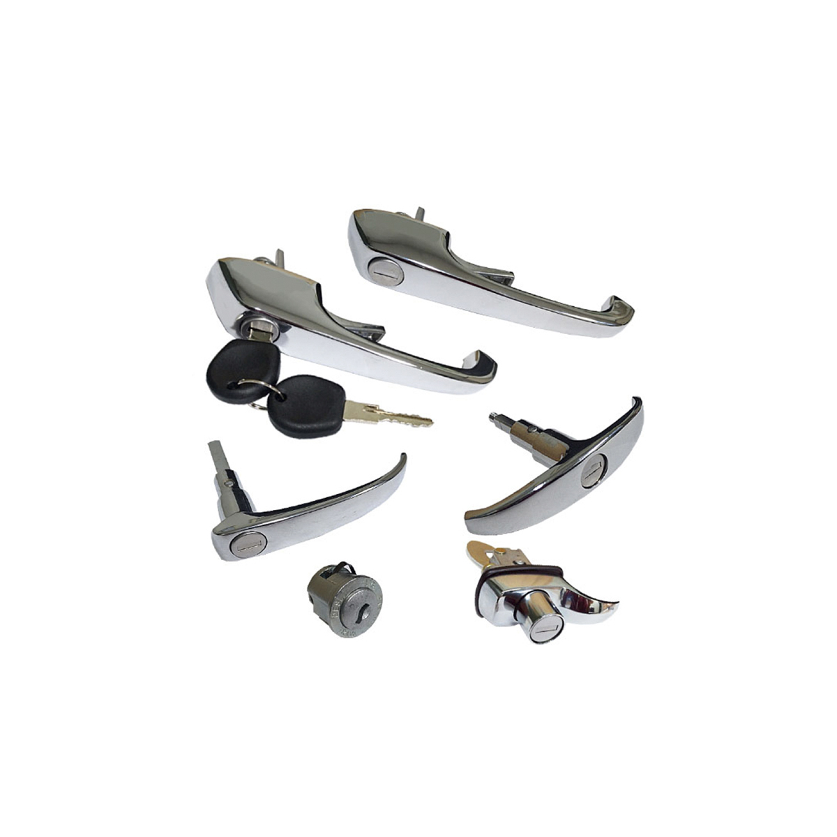 KOMBI 1976 A 1997 CROMADA (2 MACANETAS DIANTEIRAS/1 MACANETA CENTRAL/1 MACANETA TAMPA TRASEIRA/2 ROSETAS/1 MACANETA TAMPA MOTOR/1 CILINDRO IGNICAO)