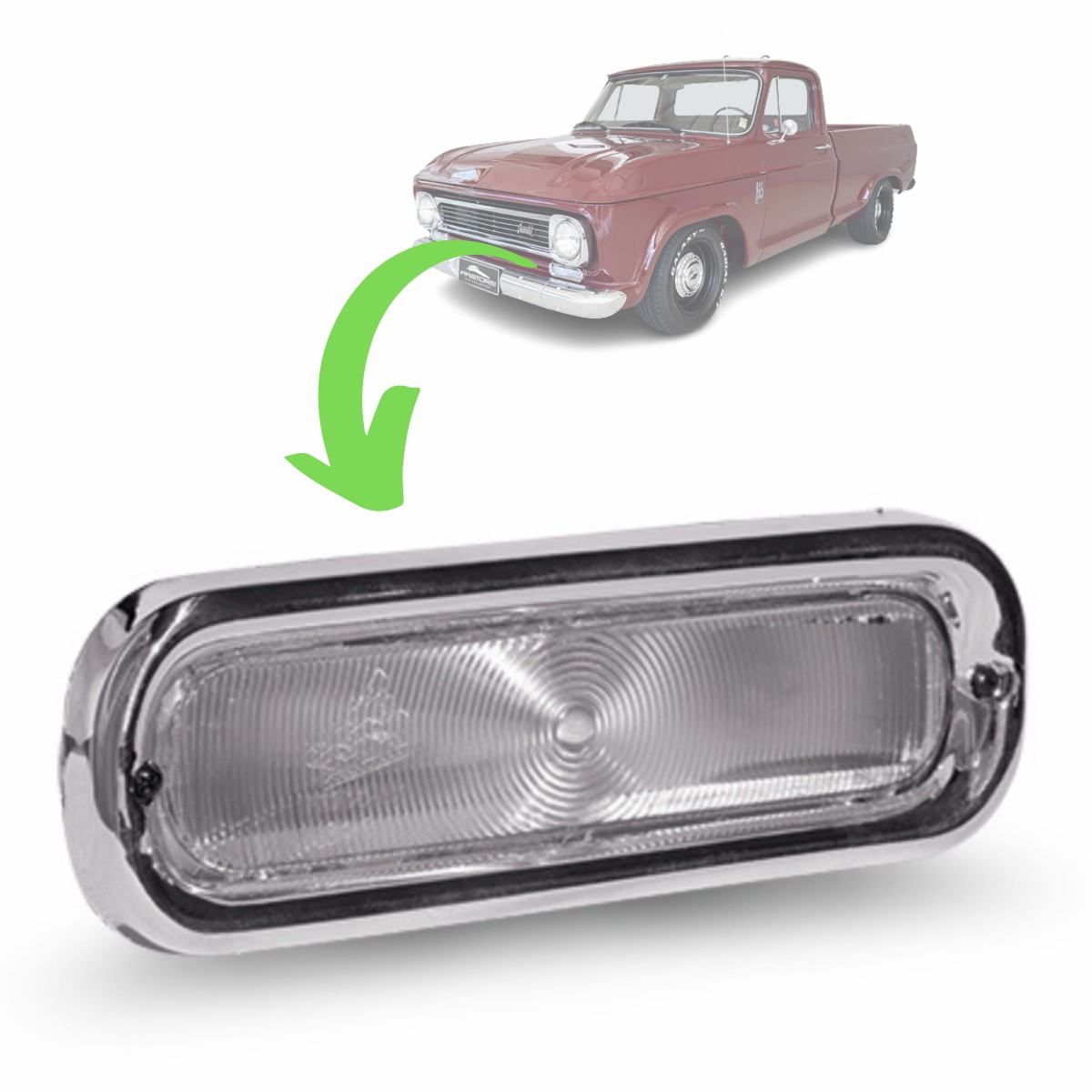 LANTERNA DIANTEIRA PARA A10, C10, D10, C14 E VERANEIO 1964 ATE 1984 CRISTAL COM ARO CROMADO LADO DIREITO E ESQUERDO 2 POLOS (ARO E CARCACA DE PLASTICO).