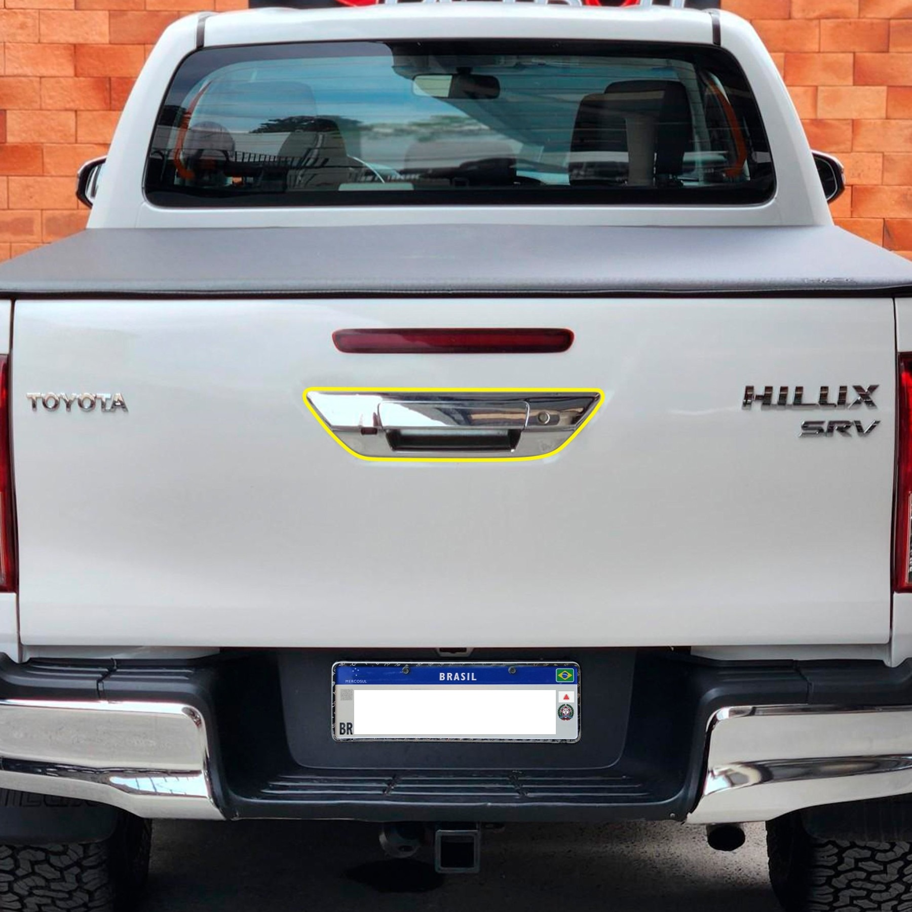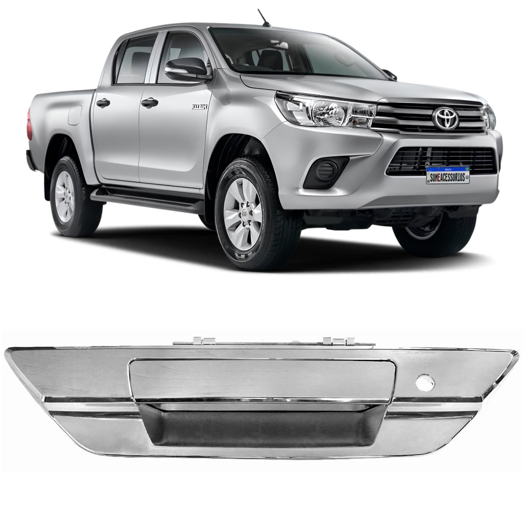 TAMPA TRASEIRA HILUX PICK-UP 2015 A 2018 CROMADA COM FURO PARA CHAVE/SEM CILINDRO E CHAVE/SEM FURO PARA CAMERA DE RE
